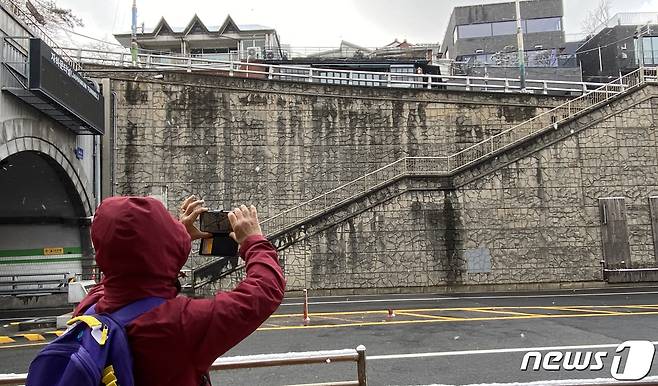(서울=뉴스1) 박지혜 기자 = 제92회 아카데미 영화제 4관왕을 차지하며 한국은 물론 아시아와 세계 영화사를 새로 쓴 영화 ‘기생충’ 촬영지를 한류관광 명소로 개발한다. 서울시와 서울관광재단은 아카데미 시상식 이후 기생충 주요 촬영지를 탐방하는 ‘기생충 팸투어’ 개발 구상을 내놨다. 시상식 이후 봉 감독의 디테일한 감성을 엿볼 수 있는 공간으로 촬영지에 대한 관심이 급증하면서다. 아현동 돼지쌀슈퍼와 계단, 종로 자하문터널, 노량진 스카이피자 등 네 곳을 코스로 엮어 해설사가 동행하는 탐방 프로그램을 운영할 계획이다. 16일 오후 한 시민이 기생충 촬영지였던 서울 종로구 자하문터널 계단을 스마트폰에 담고 있다. 2020.2.16/뉴스1