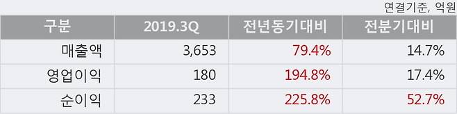 - 2019.3Q, 매출액 3,653억(+79.4%), 영업이익 180억(+194.8%)