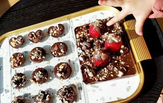 서현이와 세은이는 딸기와 견과류를 사용해 초콜릿을 만들었다.