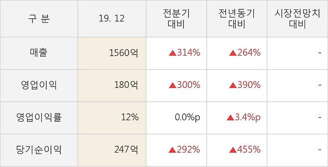 매출액은 1560억원으로 전년 동기 대비 264% 증가했고, 영업이익은 180억원으로 390% 늘어났다.