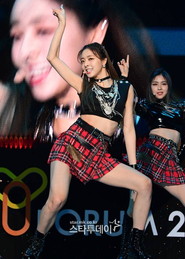 그룹 있지(예지, 리아, 류진, 채령, 유나)가 화려한 축하무대를 선보이고 있다.