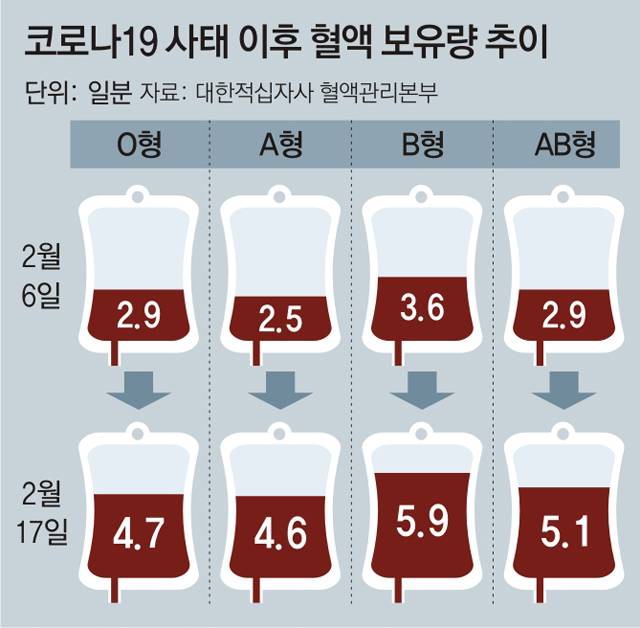 혈액 보유량이 5일분을 넘은 건 국내에서 코로나19 첫 확진자가 나온 지난달 20일 이후 처음이다. 6일 평균 혈액 보유량이 2.9일분에 그쳤던 걸 감안하면 놀라운 변화다. 감염병이 없었던 지난해 동 시점(4.7일분)보다 더 많다.