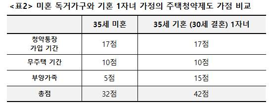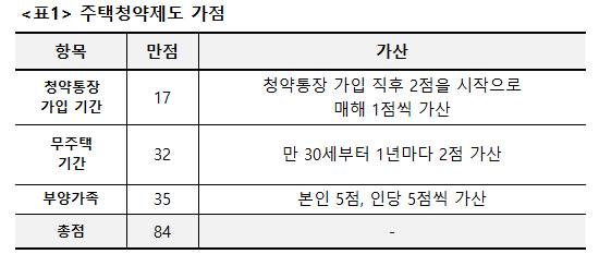 현행 주택청약제도는 혼자 사는 무주택자보다 이미 집이 있더라도 결혼해 아이가 있는 사람에게 유리하다. 당초 주택청약제도는 투자 목적으로 집을 구입하는 사람이 아닌, 실수요자를 배려하고자 나온 정책이다. 목적으로만 본다면 소형주택은 신혼부부나 사회초년생에게, 대형주택은 가족이 많은 가정에게 가는 것이 합당하다. 하지만 서울 및 수도권의 소형아파트가 좋은 투자처로 떠오르면서 부양가족이 많은 중장년층도 소형아파트 분양에 뛰어들었다. 현재 무주택 기간보다 부양가족이 많은 쪽이 청약 가점이 높다 보니, 서울의 작은 집도 대부분 중장년층의 손에 들어가게 됐다.