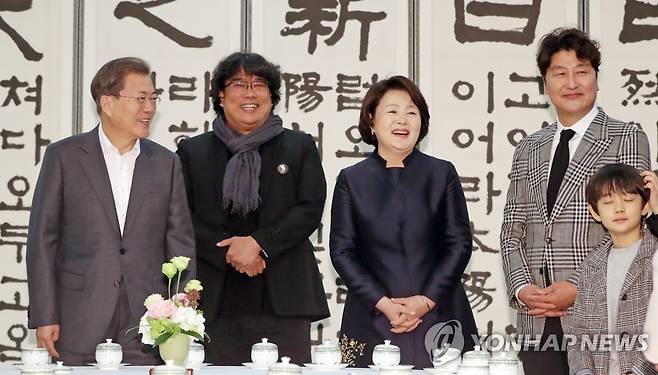 (서울=연합뉴스) 한상균 기자 = 문재인 대통령과 김정숙 여사가 20일 청와대에서 영화 '기생충' 봉준호 감독, 송강호 배우 등과 환담하고 있다. 2020.2.20