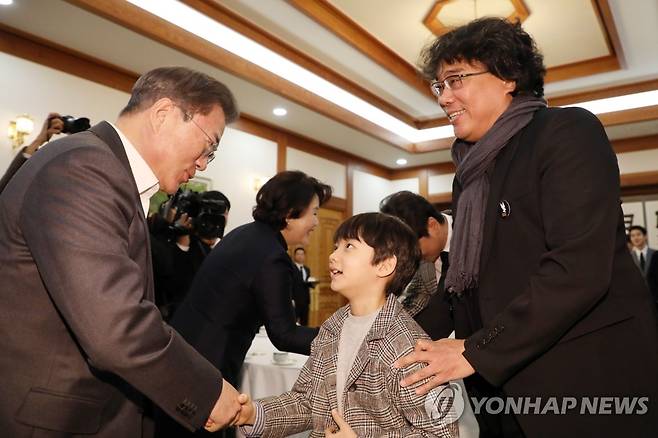 (서울=연합뉴스) 한상균 기자 = 문재인 대통령이 20일 청와대에서 영화 '기생충' 제작진, 배우 초청 오찬에 앞서 봉준호 감독, 아역배우인 정현준 군과 인사하고 있다. 2020.2.20