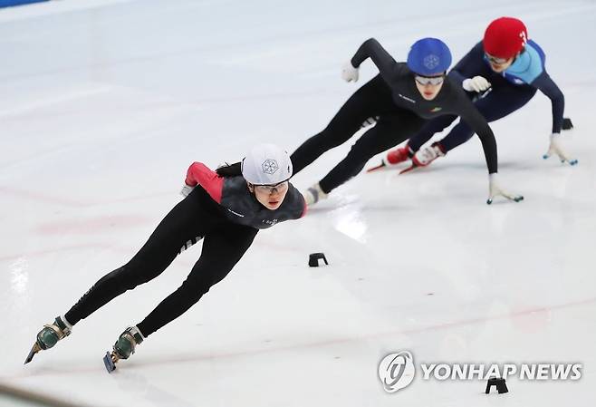 (성남=연합뉴스) 홍기원 기자 = 20일 경기도 성남시 탄천종합운동장 빙상장에서 열린 제101회 전국 동계체육대회 쇼트트랙 여자일반부 1,000m 결승에서 심석희가 역주하고 있다. 2020.2.20