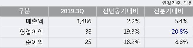 - 2019.3Q, 매출액 1,486억(+2.1%), 영업이익 38억(+19.3%)