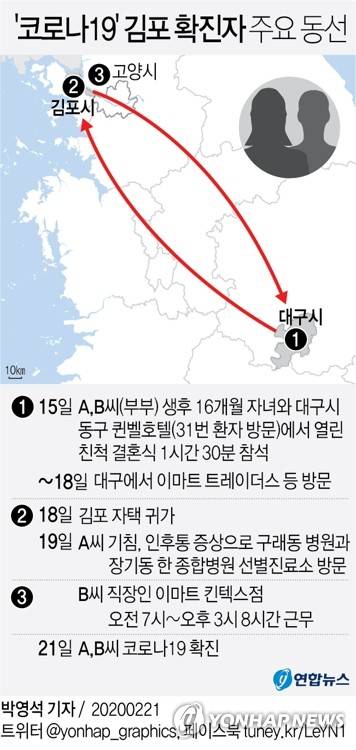 (서울=연합뉴스) 박영석 기자 = 21일 경기 김포지역에 신종 코로나바이러스 감염증(코로나19) 확진자 2명이 발생하자 이들 부부가 머물렀던 지역 주민들은 바짝 긴장하는 분위기다.