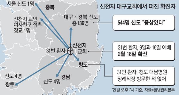 1차 감염원 찾기가 방역당국에 숙제로 남아 있는 가운데 전국 신천지 교인이 정기적인 봉사활동이나 예배를 위해 거주 지역을 벗어나 다른 지역 활동에도 적극 참여한 점이 이번 전국 확산을 가속화한 결정적인 이유가 됐다는 진단이 나온다. 21일 경남 지역에서 처음 발생한 확진자들도 모두 신천지 대구교회를 다녀온 뒤 확진 판정을 받았고, 광주 지역 추가 확진자 역시 대구 예배에 참석한 것으로 확인됐다. 충북 증평 소재 군부대 장교 역시 신천지 교인인 여자친구를 만난 뒤 복귀했다가 확진 판정을 받았다. 이들은 대부분 해외여행력이 없어 초기 '입국자 관리'에만 주력해온 보건당국 방역망에서는 완전히 벗어나 있었다. 신천지는 적극적인 포교를 위해 전국에 수많은 관련 시설을 운영하고 있다. 기독교 계열 이단연구자들에 따르면 전국 신천지 관련 집회 장소는 교회 70여 곳, 복음방 740곳, 위장센터 125곳이 있는 것으로 파악된다.