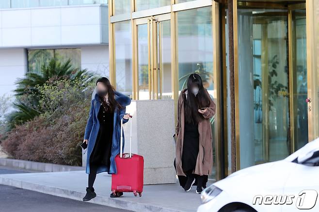(서귀포=뉴스1) 오현지 기자 = 22일 오전 제주 서귀포시 한 호텔에서 마스크를 쓴 투숙객들이 나서고 있다.