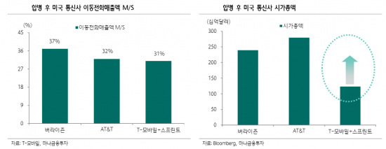 김홍식 하나금융투자 연구원은 이날 보고서에서 "미국 연방법원이 스프린트와 T-모바일 간 합병을 승인한 데 이어 뉴욕·텍사스주 등이 합병 반대 항소를 포기하면서 사실상 합병이 확정됐고, 가입자 가치를 감안하면 경쟁사 대비 시가총액이 너무 적다고 평가되기 때문"이라고 설명했다.