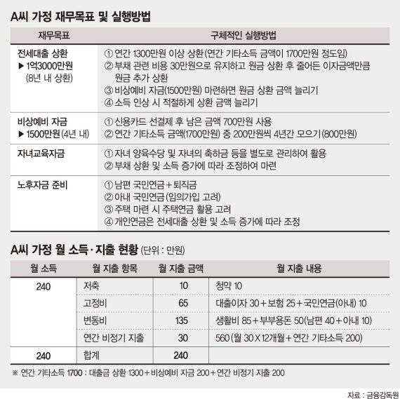 뿐만 아니라 금감원은 A씨 부부가 계획 없이 사용하고 있는 부부용돈과 생활비가 가처분 소득의 60% 정도를 차지할 정도로 매우 크다고 지적했다. 신용카드 및 무이자 할부를 적극적으로 활용하고 있는 데다 월 지출과 연간비정기적인 지출을 구분하지 않고 사용해 즉흥적인 소비지출이 늘어났다. 아울러 자녀 출산과 양육 등의 자연스런 지출의 증가뿐만 아니라 소득이 늘어남에 따른 자발적인 지출이 늘어 소비의 규모가 커진 것으로 분석했다. 금감원은 이에 부채상환 계획, 자녀교육비, 노후준비 등의 재무목표를 세울 것을 주문했다.