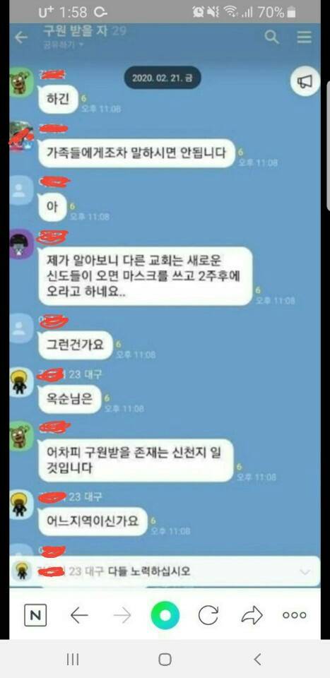 이와 함께 “제가 알아보니 다른 교회는 새로운 신도들이 오면 마스크를 쓰고 2주 후에 오라고 하네요”라고 하니, “그런 건가요” “어차피 구원 받을 존재는 신천지일 것입니다”라고 설명했다.