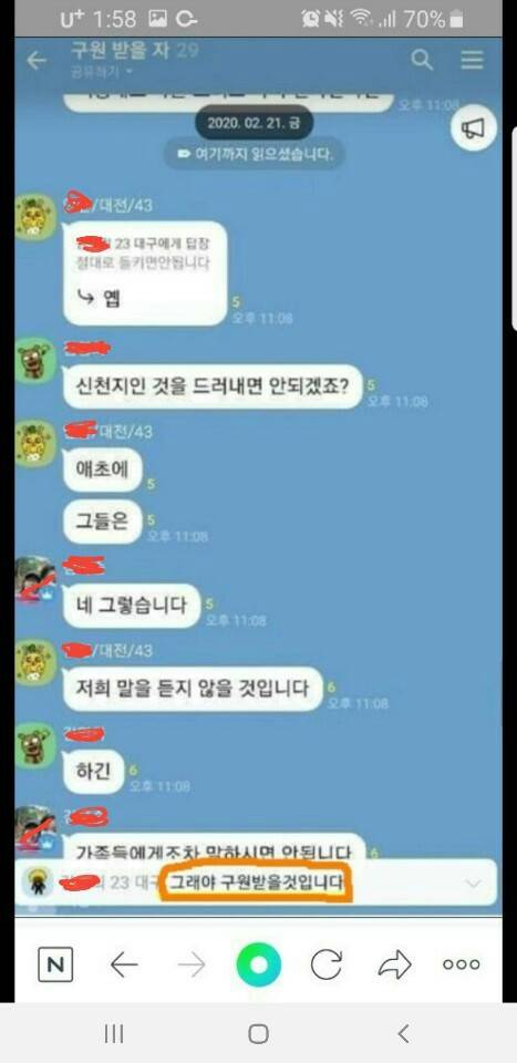카카오톡 신천지 신도 간 단체채팅방 ‘구원받을 자’에는 신종 코로나바이러스 감염증(코로나19)과 관련, “전 일단 정동교회로 갈까 생각 중입니다” “저는 지령대로 근처 교회에 가서 퍼뜨릴 예정입니다” “지령을 받으셨나요?”라는 내용이 적혀있다.