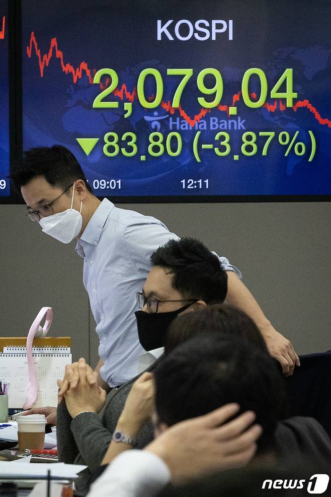 (서울=뉴스1) 유승관 기자 = 신종 코로나바이러스 감염증(코로나19) 확산에 투자심리가 냉각된 24일 서울 중구 하나은행 명동점 딜링룸 전광판에 코스피 지수가 전 거래일 대비 83.80포인트(3.87%) 하락한 2079.04를 나타내고 있다. 이날 코스닥 지수는 전 거래일 대비 28.70p(4.30%) 내린 639.29를, 달러/원 환율은 11.0원 오른 1220.2원으로 장을 마감했다. 2020.2.24/뉴스1