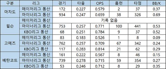 LG의 외국인 3루수 정책이나 NC와 베탄코트의 동행, 또 지난해 직접 겪은 아수아헤 등의 실패 사례들이 그것이다. 실제 지난해 정규시즌 1~3위 팀인 두산-SK-키움은 타격이 강점인 외국인 타자를 보유한 공통점이 있기도 하다.