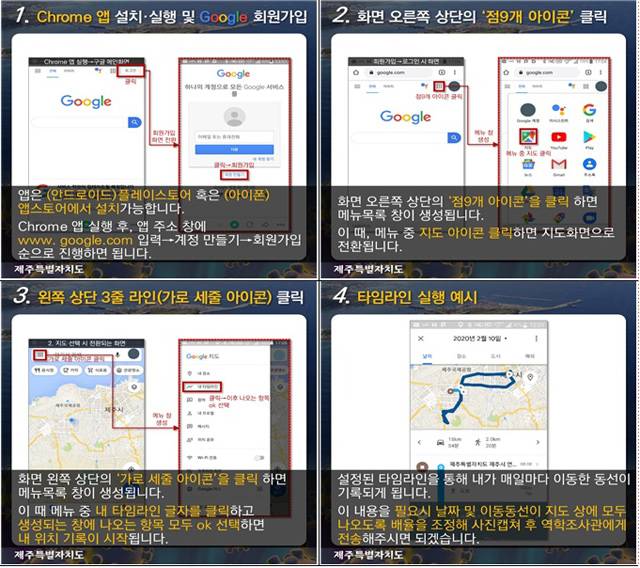 시행을 위해 제주도는 구글 타임라인의 설치와 활용이 쉽도록 카드뉴스 형태의 가이드를 제작했고, 이른 시일 내 이를 배포해 도민들의 자발적 위치기록 참여를 촉구할 예정입니다.