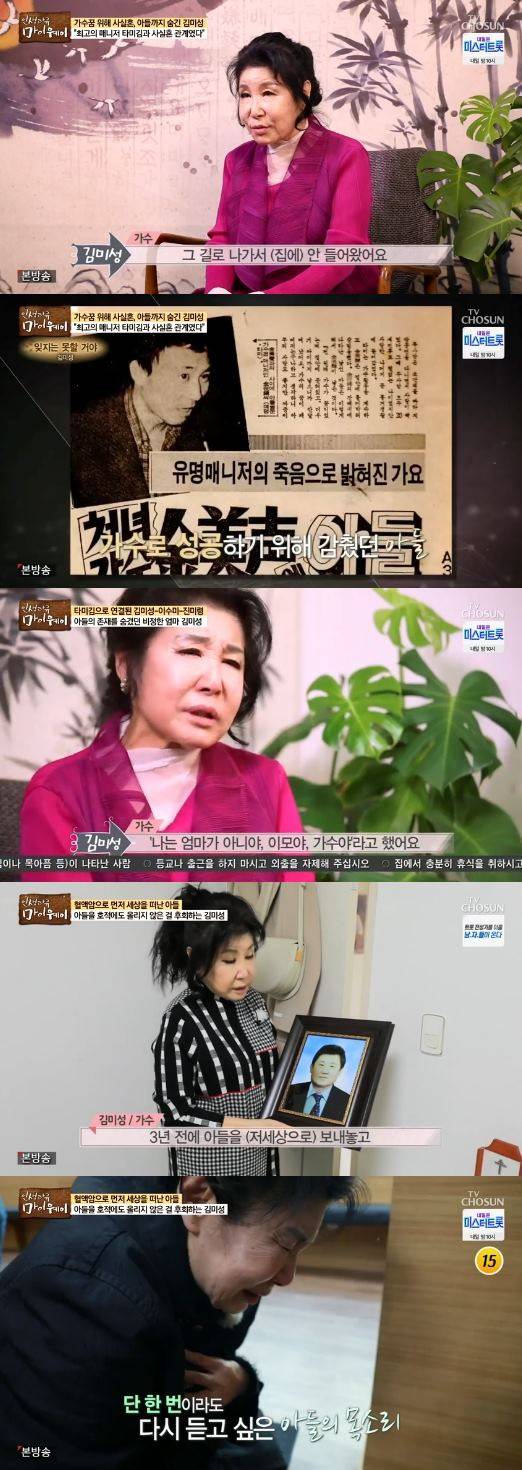 이날 김미성은 가수 활동을 위해 사실혼 관계, 아들의 존재를 숨겨야만 했다고 밝혔다.
