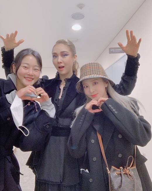 공개된 사진에는 뮤지컬 '레베카'에 댄버스 부인 역으로 출연 중인 옥주현과 함께 인증 사진을 촬영 중인 가수 산다라박, 모델 강승현의 모습이 담겼다. 옥주현은 댄버스를 나타내는 포즈로, 강승현과 산다라박은 하트 포즈를 지어 훈훈함을 안겼다.
