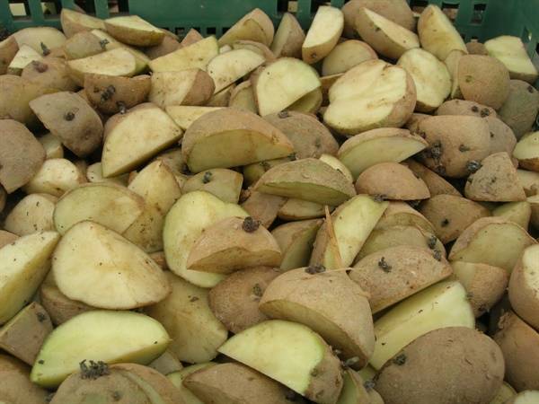 20일을 전후로 감자에서 3mm 정도의 싹(씨눈)이 자라면 1, 2개의 싹이 붙어있는 여러 조각으로 잘라준다. 잘라낸 감자속이 검은것(흑색심부병)은 불량 씨감자로 심지 않도록 한다. 탁구공 만한 작은 씨감자는 절단하지 않아도 되며, 조각낸 씨감자는 그늘에서 3~5일정도 지나면 절단된 부위의 상처가 아물고 밭에 심으면 된다. 조각낸 씨감자는 싹이 위쪽을 보거나 아래쪽을 보거나 상관없이 심어도 된다.