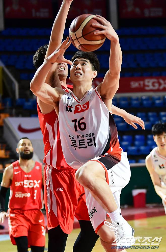 2019-2020 프로농구 서울SK와 부산 KT의 경기가 27일 잠실학생체육관에서 열렸다. KT 김윤태가 SK 김승원의 수비 사이로 레이업 슛을 시도하고 있다.