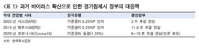 실제로 사스와 메르스 발병 당시 편성된 2003년 2차 추경과 2015년 추경 이후 코스피는 견조한 오름세를 보였다. 박 연구원은 “코스피 지수는 2002년 11월 사스 발병 후 4개월간 11.2%, 2015년 5월 메르스 발병 이후 4개월간 9.8% 각각 하락했다”며 “추경 편성 이후 2003년 11월~2004년 4월, 2015년 9~12월 코스피는 각각 8.9%와 2.5% 상승했다”고 분석했다.