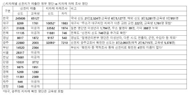 또 부산에서는 지금까지 부산지역 확진자 중 역학조사를 통해 신천지로 확인된 4명의 이름이 정부의 명단에는 아예 없었다고 문제를 제기했다. 이외에 경남의 경우도 자체 조사한 명단은 9,157명이었지만 정부에서 건네받은 명단은 8,617명으로 540명 차이가 났다.