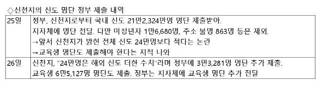 서울경제의 취재 결과 현재까지 지자체가 직접 입수한 명단과 정부가 신천지로부터 제출받아 지자체에 전달한 명단에 차이가 있다고 한 지자체는 대구·경기·전북·광주·경남·부산 등 6곳이다. 정부는 지난 25일 신천지로부터 제출받은 국내 신도 21만2,324만명을 주소지 기준으로 선별해 지자체에 내려보냈다. 또 26일에는 교육생 6만5,127명과 해외 신도 3만3,281명의 명단을 추가로 제출받아 교육생에 대한 명단도 내려보냈다.
