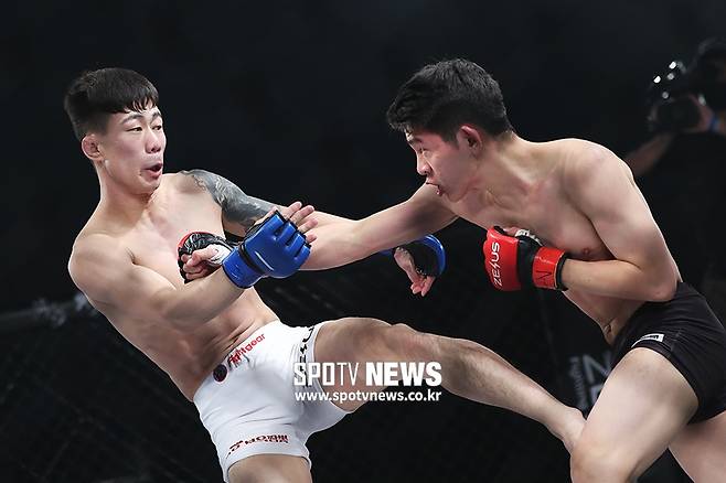 [스포티비뉴스=서울, 곽혜미 기자] 정다율 볶음짬뽕 제우스FC 004 대회가 29일 오후 서울 서대문구 홍은동 스위스 그랜드호텔에서 열렸다. 메인 카드 메인 매치에서 최승국(흰색)과 이승철이 경기를 펼치고 있다.