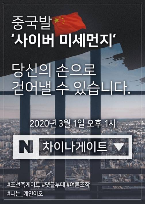 해당 게시글에 지지하는 사람들은 삼일절인 오늘 오후 1시 네이버에 ‘차이나게이트’, ‘나는 개인이오’를 검색해 일명 ‘실검 운동’을 펼칠 예정인 것으로 전해졌다.