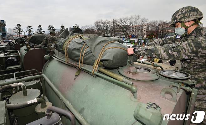 (포항=뉴스1) 최창호 기자 = 해병대 1사단 화생방 대대 부대원들이 1일 포항시 남구청 주차장에서 신종 코로나바이러스 감염증(코로나19) 제독 작업을 앞서 약품을 제독차량 탱크에 투입하고 있다. 해병대는 포항시와 함께 제독차량 4대 등 총 10여 대를 투입 대구~포항 고속도로 진출입로와 시가지 일원에서 방역 작업을 실시했다. 2020.3.1/뉴스1