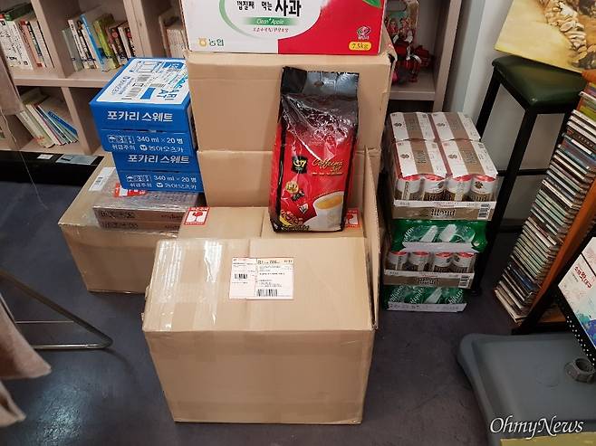 "기사가 나가고 난 다음날부터 바로 전국에서 구호품이 왔어요. 도시락에 라면에 비누, 물, 음료수, 과일, 컵밥... 여기 맥주까지 왔네요. 하하하."