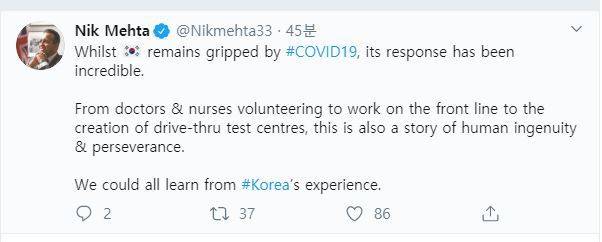 ![[서울=뉴시스]닉 메타 서울주재 영국대사관 부대사. 메타 부대사는 3일 한국에서 신종 코로나바이러스 감염증(코로나19)가 크게 창궐하면서 한국이 큰 충격에 빠져 있지만 코로나19에 대한 한국의 대응은 믿기 어려울 정도라며 세계는 모두 이러한 한국의 경험으로부터 많은 것들을 배워야 할 것이라고 트위터를 통해 밝혔다. <사진 출처 : 닉 메타 부대사 트위터> 2020.3.3](https://img4.daumcdn.net/thumb/R658x0.q70/?fname=https://t1.daumcdn.net/news/202003/03/newsis/20200303141148211fhaf.jpg)