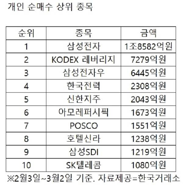 3일 한국거래소에 따르면 지난 한달간(2월3일~3월2일) 개인은 레버리지 상장지수펀드(ETF)인 코덱스(KODEX)레버리지를 약 7279억원 가량 순매수했다. 레버리지 ETF는 지수가 오를 때 수익을 낼 수 있는 상품이다. 최근 개미들이 8거래일 연속 코덱스 레버리지를 대거 사들이면서 개인 순매수 2위 종목에 오른 상태다. 개인은 코스닥150레버리지도 1053억원 순매수했다.