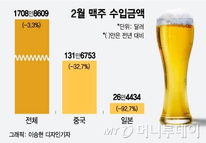 일본맥주 불매운동 효과는 이어지고 있는 것으로 나타났다. 지난 2월 일본맥주 수입금액은 26만4434달러로 전년 동월 대비 92.7% 급감한 수준이었다. 다만 지난 1월 수입 12만5649달러보다는 2배 이상 늘었다.