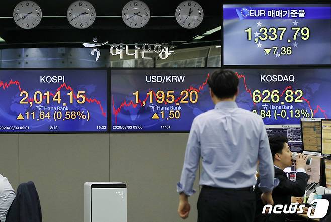 (서울=뉴스1) 안은나 기자 = 개인 매수가 늘면서 코스피가 이틀 연속 상승한 3일 오후 서울 중구 하나은행 딜링룸 전광판에 코스피 지수가 전 거래일보다 0.58%(11.64포인트)오른 2014.15를 나타내고 있다. 2020.3.3/뉴스1
