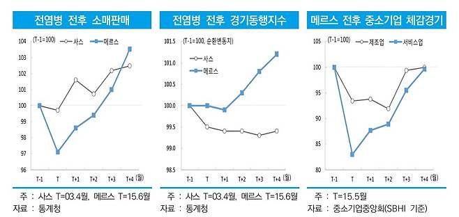 연구원은 과거 사스와 메르스 등의 사태를 참조, 코로나19 역시 확산세가 진정 국면에 접어들 경우 V자 형태의 급격한 경기 반등을 보일 것이라 전망했다. 지난 2015년 5월 국내 첫 확진자가 발생했던 메르스는 7월 신규 확진자가 발생하지 않는 등 2개월여의 확산 끝에 진정세를 맞았고, 이후 8월과 9월 사이에 급격한 경기 회복세를 보였다. 2015년 5월 83 수준까지 떨어졌던 중소기업 체감경기 지수는 8월에는 95 선을 넘었고, 9월에는 100까지 회복됐다.