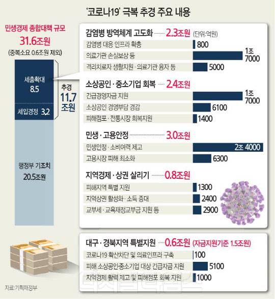 4일 정부가 의결한 11조7000억원 규모의 추가경정예산(추경) 편성안이 완료되면 신종 코로나바이러스 감염증(코로나19)에 투입되는 재정은 31조6000억원으로 불어난다. 정부는 지난달 초부터 코로나 방역, 소상공인 및 관광·해운 지원 등에 예비비 등 4조원을 투입했고 지난달 28일엔 16조5000억원 규모의 세제, 금융 지원 방안을 발표한 바 있다. 여기에 추경까지 포함하면 코로나19 대응에 32조 원 가까운 재정이 투입되는 셈이다.