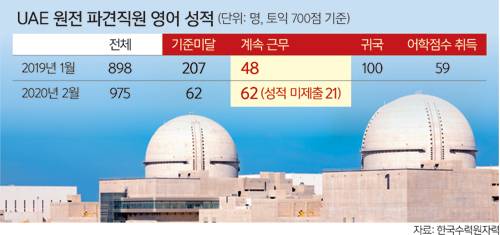 4일 한수원이 국회 산업통상자원중소벤처기업위원회 소속 미래통합당 정유섭 의원실에 제출한 자료에 따르면, 올해 2월 말 기준 UAE 원전에 파견된 한수원 직원은 975명이며, 이 중 어학 기준 미달자는 62명이다.
