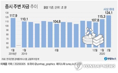 (서울=연합뉴스) 이재윤 기자 = 5일 한국은행 경제통계시스템과 금융투자업계에 따르면 지난달 말 현재 증시 주변을 맴도는 부동자금이 전월 말보다 8조7천663억원 증가한 124조906억원으로 사상 최대를 기록한 것으로 나타났다.
