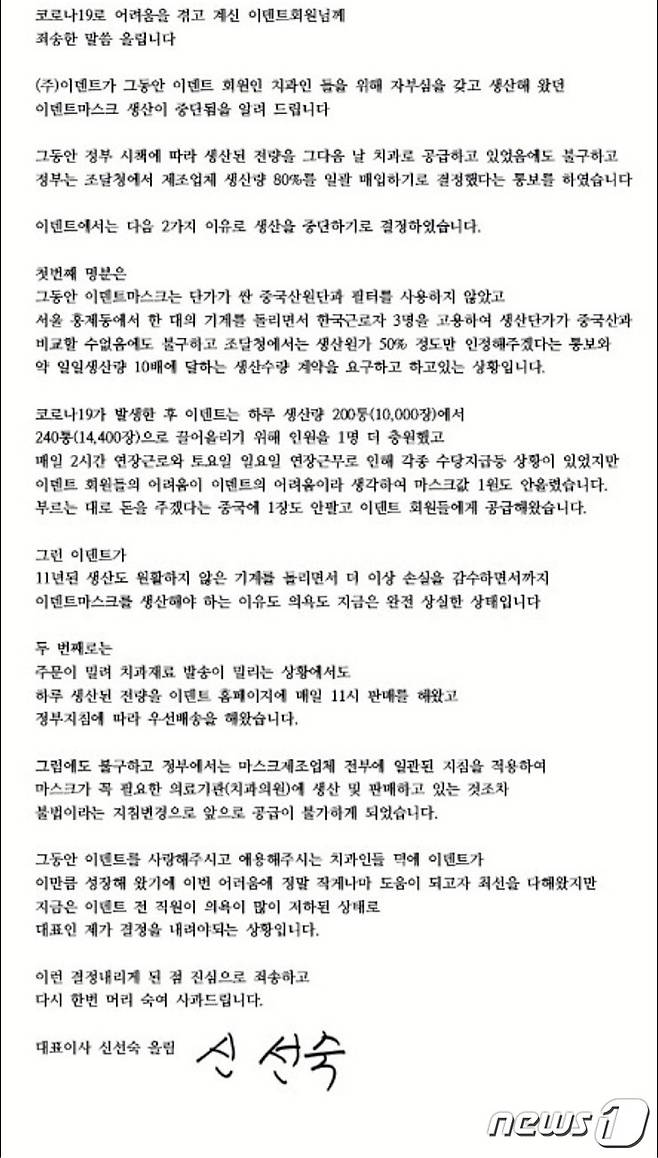 신선숙 이덴트 온라인 쇼핑몰 대표는 5일 홈페이지를 통해 "정부가 마스크 제조업체에 생산량 80%를 일괄 매입하기로 결정했다는 통보를 받았다"며 "그동안 자부심을 갖고 생산해왔던 이덴트 마스크 생산이 중단됨을 알려드린다"고 공지했다.