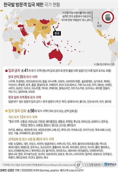 조치별로 보면 한국 전역에 대한 입국금지 조치를 취하는 곳이 37곳, 대구·청도를 중심으로 일부 지역에 대해 입국금지를 하는 나라가 6곳이다.
