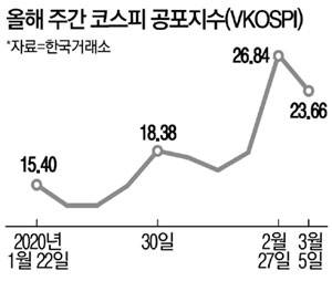 6일 코스피는 전일보다 45.04포인트(2.16%) 내린 2040.22에, 코스닥지수는 1.15% 내린 642.72에 장을 마감했다. 이날 외국인 매도가 이어지면서 장중 내내 약세장 모습을 보였다. 외국인은 지난달 24일부터 지난 3일까지 7거래일 연속 4조5000억원어치 이상을 코스피에서 팔아치웠다. 미국 연방준비제도의 긴급 금리 인하 소식에 지난 4일 잠시 순매수로 돌아서는 듯했지만 코로나19로 인해 재차 '팔자'로 전환해 5~6일 이틀간 7000억원 넘는 금액을 팔았다. 코로나19로 인해 전 세계 증시 변동성이 매우 높아지면서 한국 증시의 '공포지수'에 해당하는 VKOSPI도 연일 높은 수준을 유지하고 있다. 코로나19 공포감이 극대화되던 2월 28일 장중 고가인 34.13을 기록하며 2011년 11월 이후 8년3개월여 만에 최고치를 경신했다. 지난 2일에는 32.66으로 VKOSPI가 치솟았고, 5일에도 23.66으로 여전히 높은 변동성 수준을 유지하고 있다.