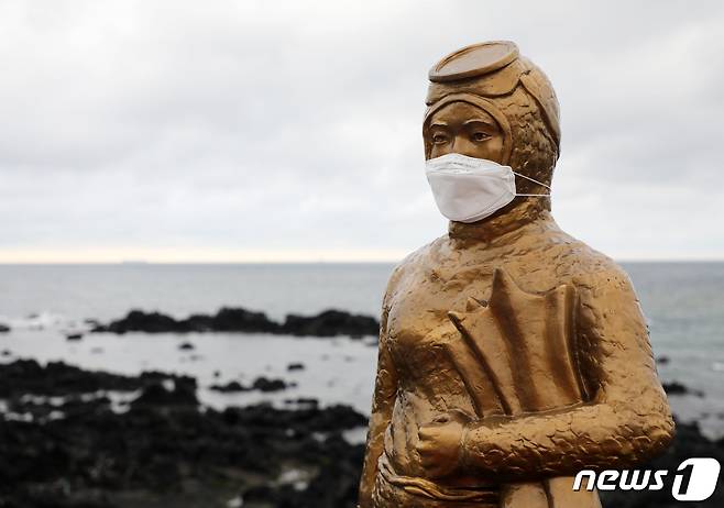 (제주=뉴스1) 홍수영 기자 = 신종 코로나바이러스 감염증(코로나19)이 확산세를 보이고 있는 7일 제주 제주시 도두동 무지개해안도로의 해녀 동상이 마스크를 쓰고 있다. 이날 제주에서는 첫 코로나19 완치 환자가 나왔다.2020.3.7/뉴스1