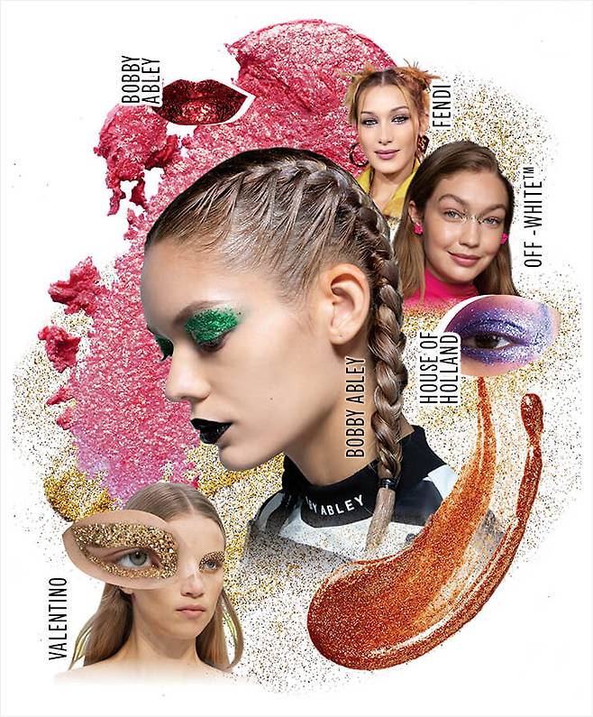 그동안 글리터를 눈머리나 애굣살에 살짝 터치해 청순한 눈물 효과를 주는 정도로만 사용했다면 좀 더 대담해져도 좋겠다. 보석을 갈아 넣은 듯 화려하게 반짝이는 글리터가 눈, 코, 입을 수놓으며 모델들을 우주 소녀로 변신시켰으니까. 골드 섀도와 스와로브스키를 눈썹까지 덮어 메탈릭한 윙 아이를 완성한 발렌티노, 얇은 금박을 콧대에 가로질러 밀착시킨 오프화이트tm, 레드 글리터로 입술을 가득 메운 바비 에이블리 모두 걸 크러시 넘치는 여전사의 모습. 하우스 오브 홀랜드는 퍼플·그린 등 다채로운 글리터로 눈가를 물들였고, 펜디 역시 언더라인에 뭉갠 실버 글리터로 밤새 눈물을 훔친 듯 얼룩진 스머지 아이를 연출했다. 얼굴이 글리터 범벅이 될까 봐 걱정이라고? 픽서를 뿌린 브러시에 글리터를 묻혀 바르고, 이를 한 번 더 스프레이로 고정시키면 온종일 번짐 없이 유지될 것.