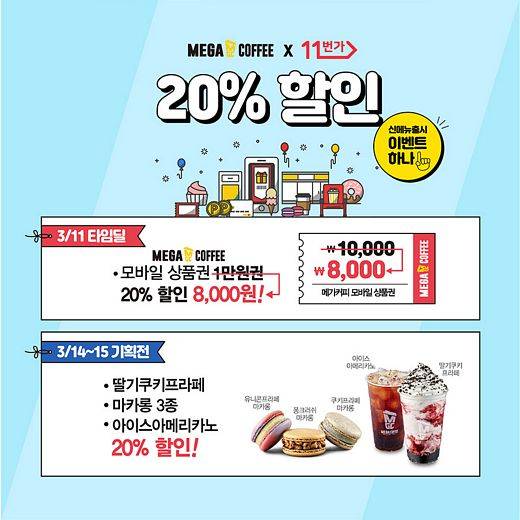한편 메가커피는 신메뉴 출시를 3월 11일, 3월 14일~15일에는 11번가에서 인기메뉴 및 신메뉴 20% 할인 프로모션이 타임딜과 기획전으로 진행되며, 메가커피 전용 앱에서는 3월 11일 ~ 31일까지 추첨을 통해 500명에게 신메뉴 모바일 상품권을 증정한다.