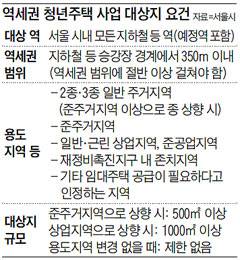"역세권 청년주택이 가능한 범위는 해당 부지의 면적 절반이 지하철 승강장 경계로부터 직선거리로 350m 이내에 있는 경우다. 서울시 홈페이지에서 서울 307개 역의 역세권 범위를 확인할 수 있다."