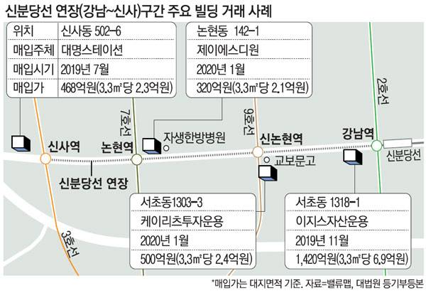 신분당선 연장선 종점 격인 신사역 6번 출구 북쪽 건물(신사동 502-6)은 지난해 468억원에 거래됐다. 대명그룹 계열 상조업체(장례식장 및 장의 관련 서비스업)인 대명스테이션은 대지면적 3.3㎡당 약 2억3000만원에 샀는데 2015년 인근 대형건물이 3.3㎡당 1억8000만원에 거래된 것보다 뛰었다.