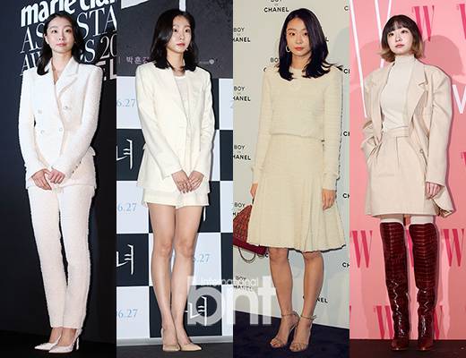 하얀 피부가 더 돋보이는 그의 화이트 룩은 우아한 백조 한 마리를 연상케 한다. 진주 단추로 장식된 수트 셋업에 똑같은 진주 디자인의 구두를 매치하는가 하면 니트 소재의 투피스에는 코튼 백을 들어 차분한 스타일링을 마무리하기도. 또한 크림 컬러의 매니시 재킷에는 레드 톤의 레더 하이부츠로 개성 있는 투톤 헤어와 잘 어울리는 하이 패션을 선보였다.