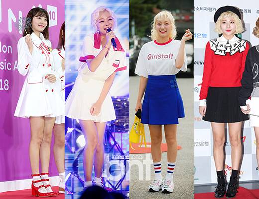 하늘하늘한 플레어스커트는 걸리시한 분위기 연출은 물론 활동성이 편해 아이돌 룩에 빠질 수 없는 아이템이다. 그는 화이트 투피스에 빨간 단추와 배색 소매로 포인트를 주거나 의상 속 빨강, 파랑, 하양 세 컬러가 모두 들어간 삭스로 깔맞춤 코디를 뽐내기도. 뿐만 아니라 플레어라 하더라도 테니스스커트, 플리츠스커트 등 디자인에 약간씩 변주를 준 센스도 돋보였다. (사진출처: bnt DB, 김다미, 안지영 인스타그램)